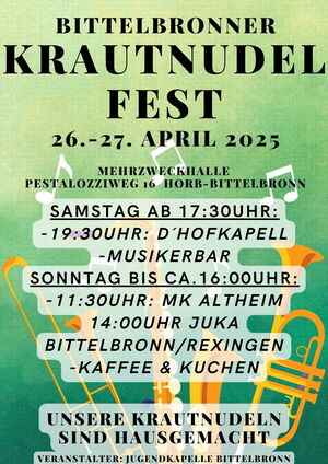 Das diesjährige KRAUTNUDELFEST findet vom 26. April bis zum 27. April in der Mehrzweckhalle Pestalozziweg 16 in Bittelbronn statt.