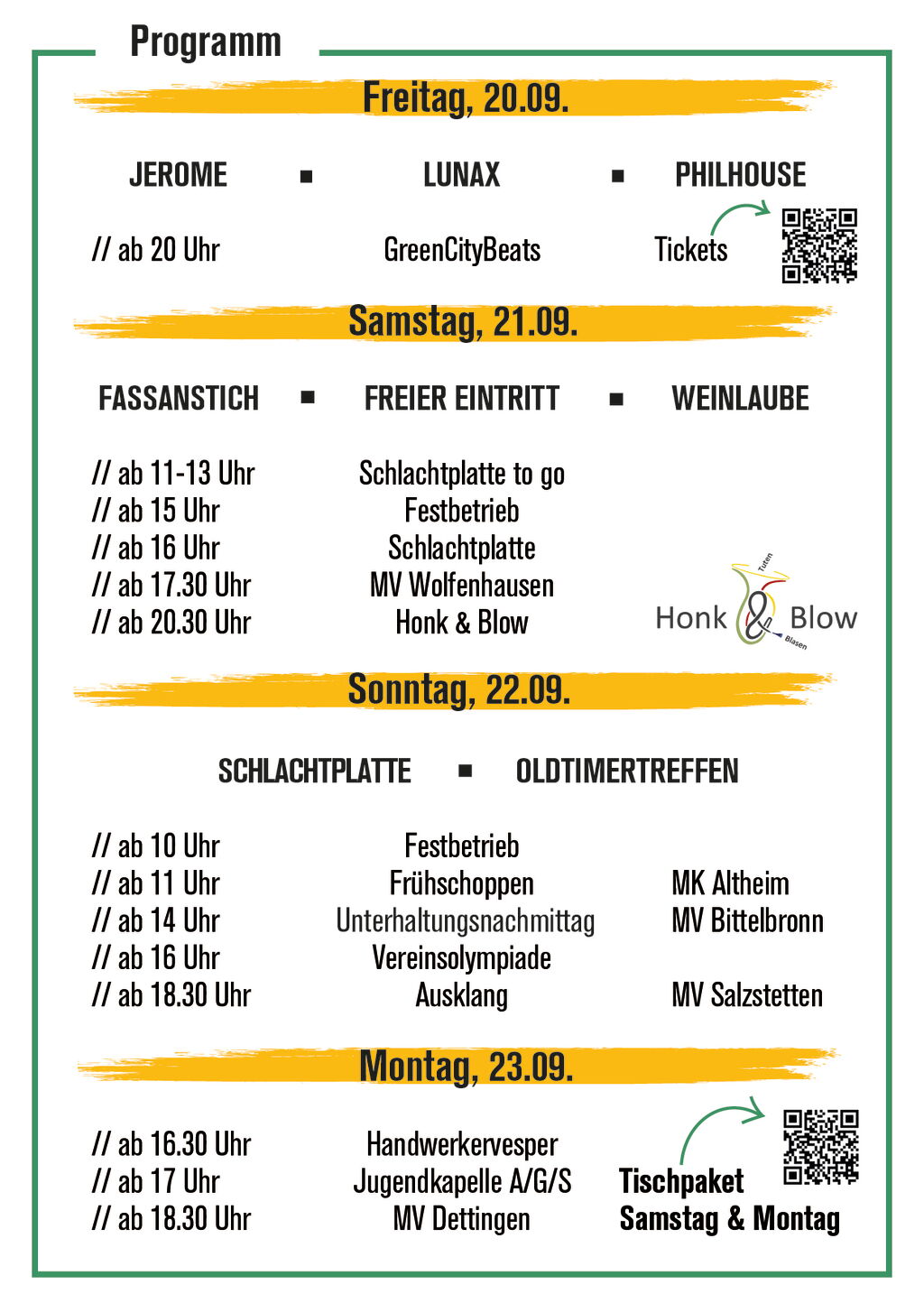 Samstag, 21. September: Der Samstag beginnt ab 11 Uhr mit dem Verkauf der Schlachtplatte über die Straße. Ab 15 Uhr beginnt der Festbetrieb. Der Abend startet mit dem MV Wolfenhausen und dem offiziellen Fassanstich. Als Highlight wird ab 20:30 Uhr Honk&Blow für mächtig Stimmung im Festzelt sorgen. Hierbei schlägt jedes Blasmusikherz höher. Für den Samstag können im Voraus Tischpakete erworben werden.