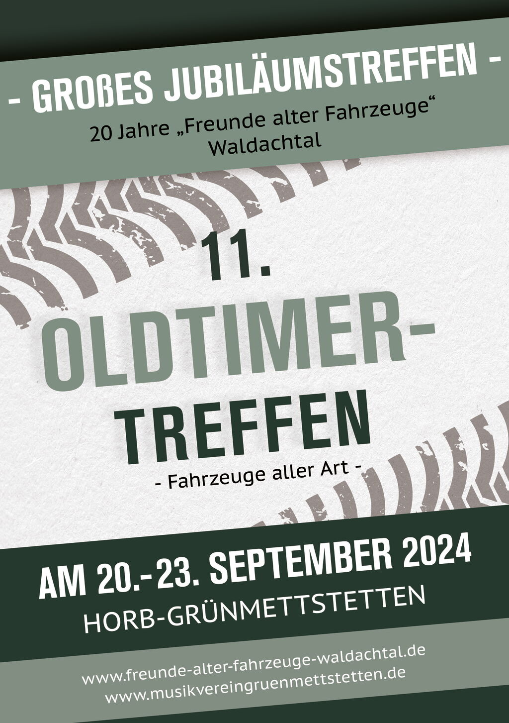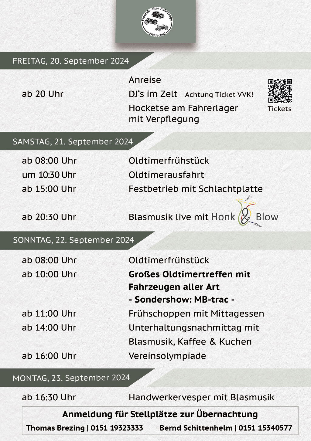 Sonntag, 22. September: Der Sonntag steht ganz im Zeichen der Oldtimer. Hier findet das Jubiläumsoldtimertreffen der "Freunde alter Fahrzeuge Waldachtal" statt. Ganz traditionell startet der Sonntag morgen mit einem Frühschoppen. Nach einem reichhaltigen Mittagessen mit unserer traditionellen Schlachtplatte sowie Schnitzel mit Pommes folgt unsere Vereinsolympiade. Musikalisch umrahmt wird der Sonntag durch die MK Altheim, den MV Bittelbronn sowie dem MV Salzstetten.