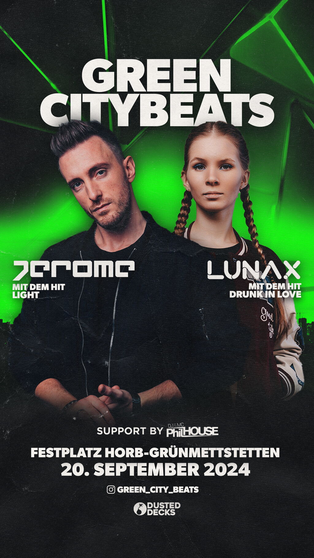 Freitag, 20. September: Der Freitagabend steht ganz unter dem Motto: GreenCityBeats. Fette Beats und eine mega Show, begleitet von den bekannten DJ's Jerome, LUNAX und DJ PhilHouse. Tickets können ganz bequem online oder vor Ort bei der Metzgerei Schetter in Grünmettstetten und Tumlingen gekauft werden.